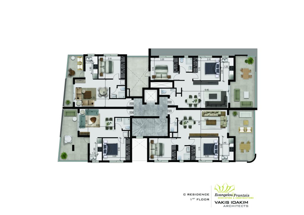 The building consists of just 13 luxurious apartments giving thus to the residents the feeling of security and privacy. In specific it consists of 4 one bedroom apartments, 7 two bedroom apartments, 1 one bedroom penthouse and 1 three bedroom penthouse apartment
