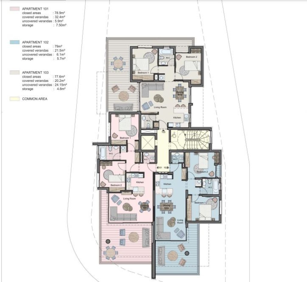 Under-construction residential building of 3 floors. Six 2-bedroom apartments 1st & 2nd floors with internal floor area of around 80 sqm. Covered parking and storage room. A project of elegant and sleek design located in a quiet, family-friendly neighborhood, ideal for young couples looking for a new property the can call home. Few minutes’ drive to “The Grammar School” (high school) and the new Primary School of Mesa Geitonia, as well as Mediterranean hospital. Easy and quick access to roundabouts of Mesa Geitonia and Agia Fyla. All apartments will be certified with performance Category A. Expected Delivery: April 2024