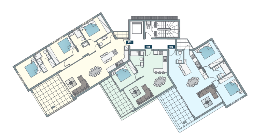 flat and 1 three-bed flat) are situated on the ground floor with their own private gardens and covered parking. Two three-bed penthouses are situated on the top floor with their own private roof garden and extra space room. The remaining flats are situated on the first and second floor (2 one-bed flats, 2 two-bed flats and 2 three-bed flats).