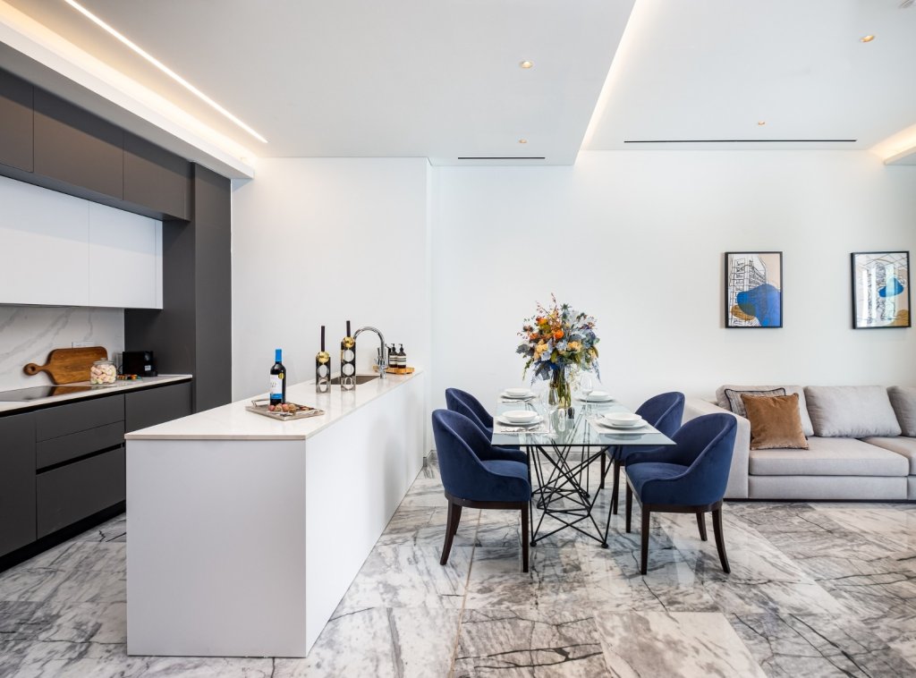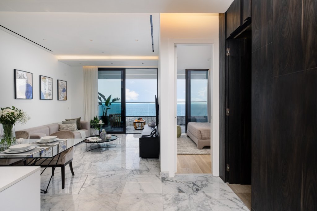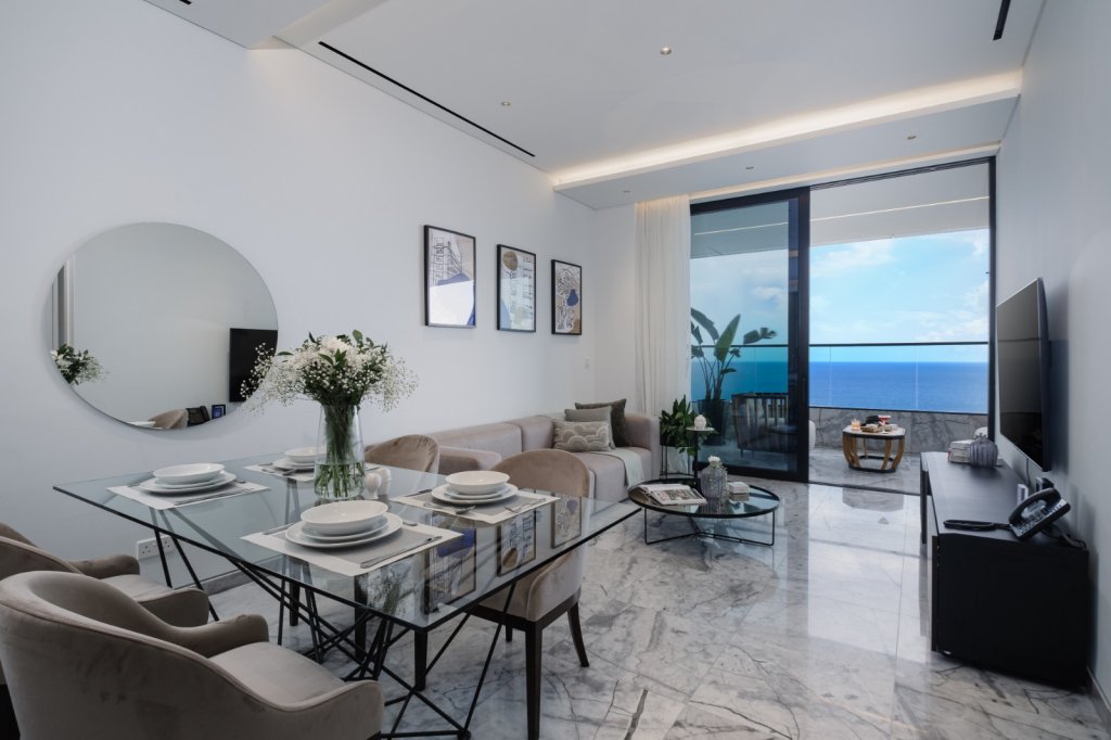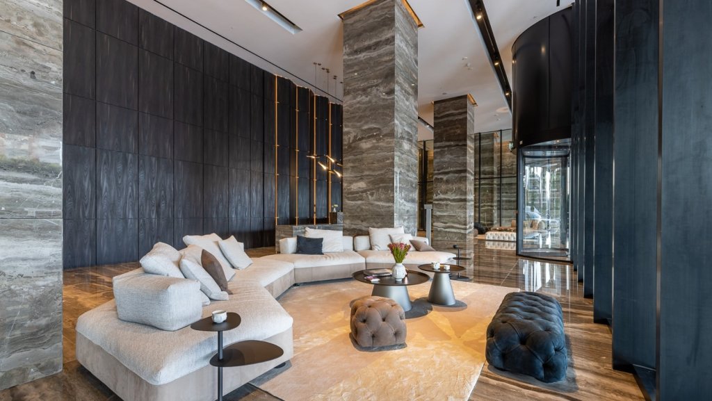 Accessible through private elevator landings, the residences are designed and finished to harmonize with the towers architecture and aesthetic. Impeccable quality is apparent throughout each residence in details like over-sized core entry doors with designed door hardware and marble floors of the highest quality. Ceilings that are thoughtfully designed with hidden light features complement the character of these lavishly designed residences. The residences also feature energy-saving windows and floor-to-ceiling glass doors, which allow abundant natural light to flood the rooms. Concealed air-conditioning units and a full installation of under-floor heating provide the residences with thermal serenity and comfort. Kitchens are outfitted with European high quality cabinetry and islands with oblique edge details while fully integrated with kitchen appliances of recognised brands. Guest, master and secondary baths offer a dramatic mix of high design and tranquillity with marble floors and marble feature walls, complemented by world-renowned brands of sanitary ware.