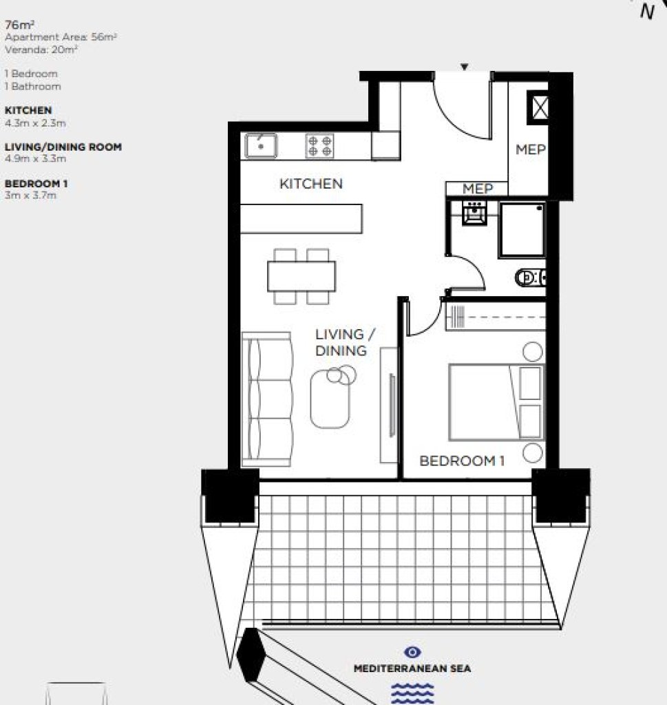 Air Conditioning, All services available, Balcony, Bus Stop Nearby, Communal Swimming Pool, Covered parking, Double Glazed Windows, Easy Access to Motorway, Elevator, Gym, Italian Kitchen, Master Bed En-Suite, Modern design, Quiet Location, Relaxation areas, Restaurants & Cafeterias nearby, Sea Views, Shops & Amenities Nearby, Telephone lines, Tennis Court, Walking distance to the Beach