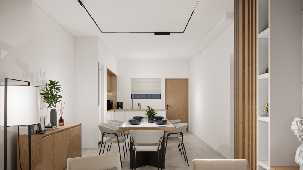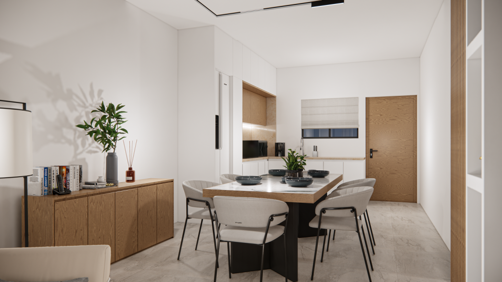 The entrance is leading to an open-plan kitchen, dining and living area, and further through the veranda door, to the covered veranda. On the left is the entrance to the corridor where are bedrooms and bathrooms. The Master bedroom is featuring an en-suite with a shower.