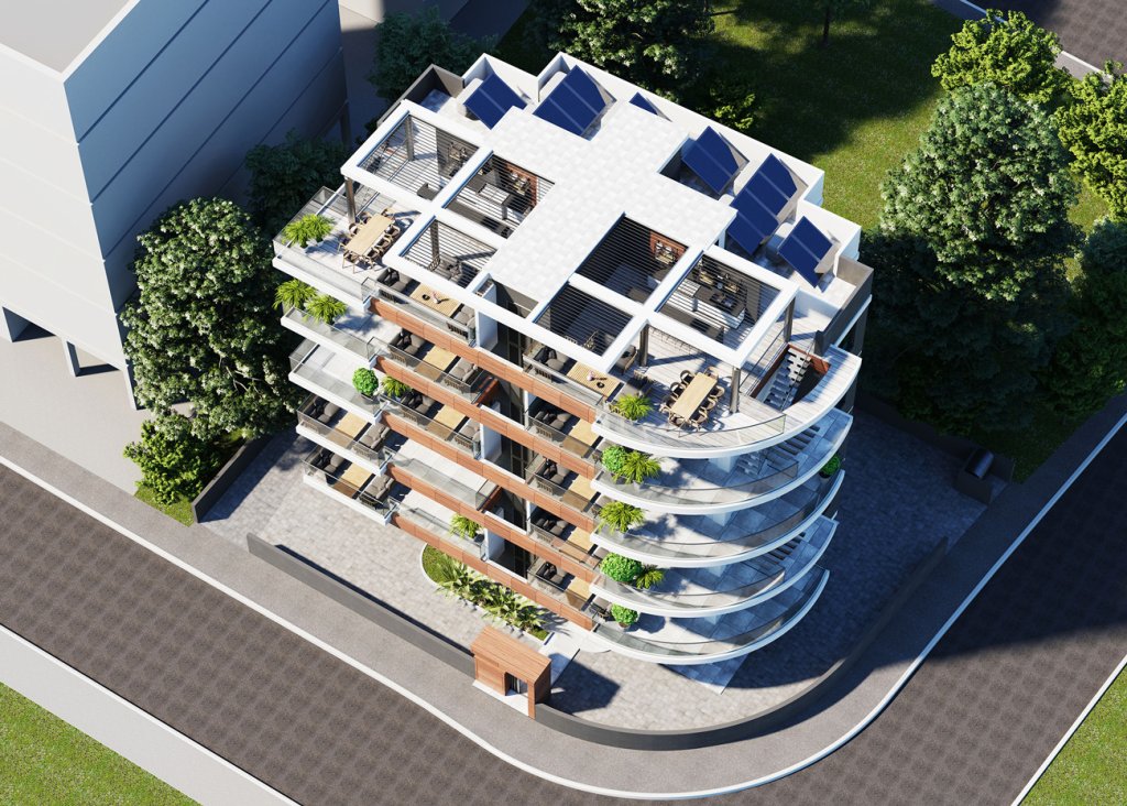 This is a high-end residential project located in the luxurious area of Strovolos in Nicosia, situated on a corner plot. This luxurious project is a 4-floors building composed of two spacious 2-bedroom apartments per floor (each with 3 bathrooms) and 2 penthouses with large terraces.