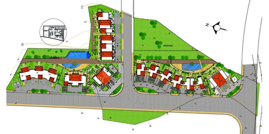 The complex is set in a tranquil and unspoilt area enjoying stunning views across Polis town, stretching down towards the coast. These 2 and 3 bedroom countryside homes are oriented around 2 large outdoor pools adjoining a paved poolside patio and large green area. Natural elements such as wood, stone  have been incorporated into the development. Design details to the exterior of these properties add a modern touch.