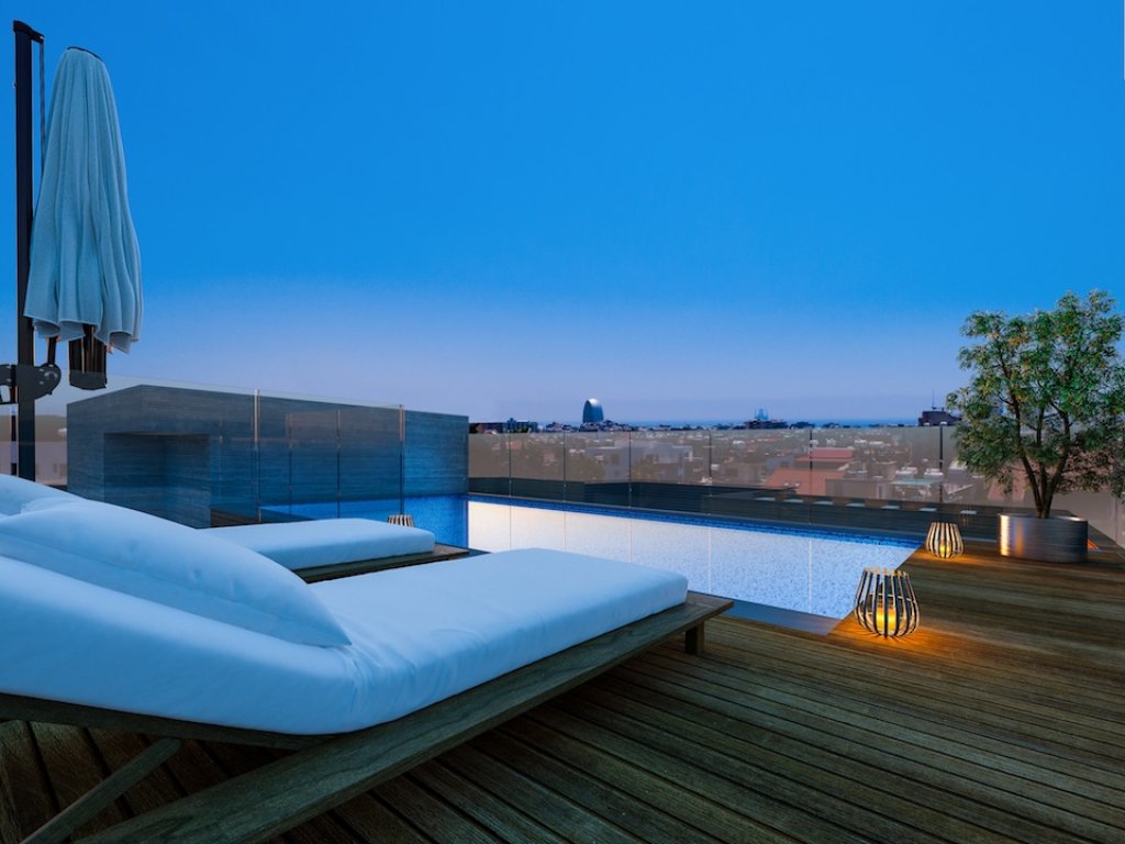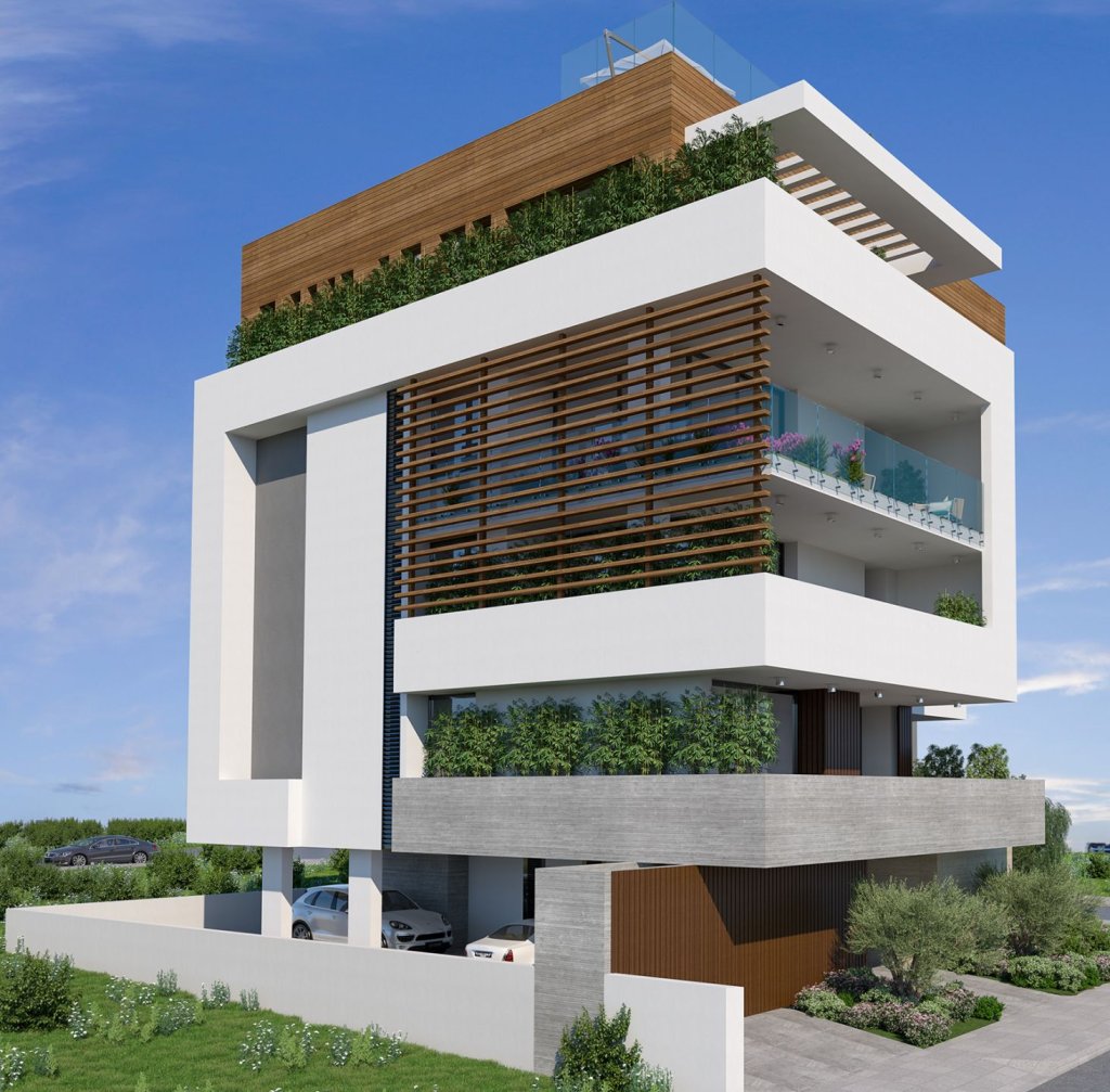 and 1 three bedroom penthouse with a roof garden and a swimming pool. The building is surrounded by green areas.