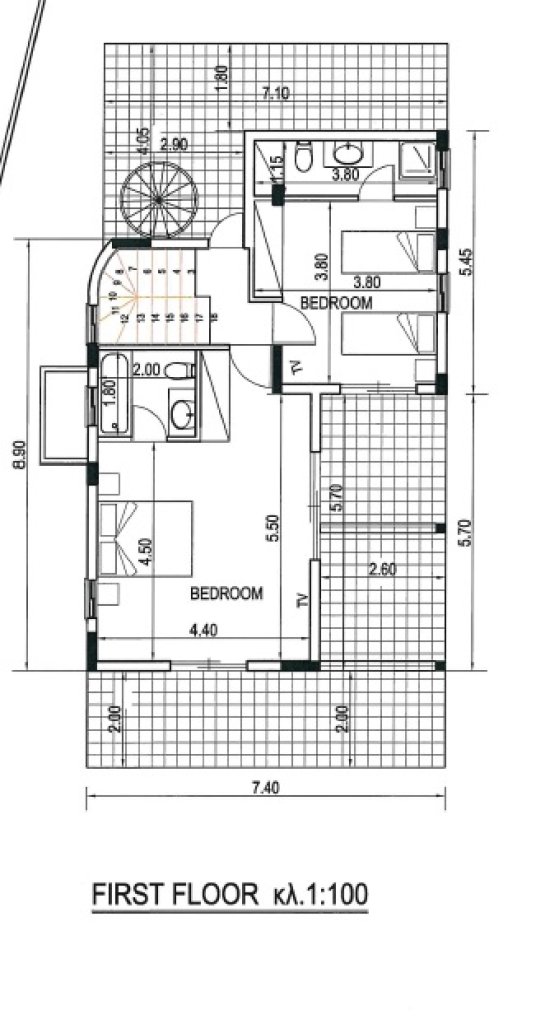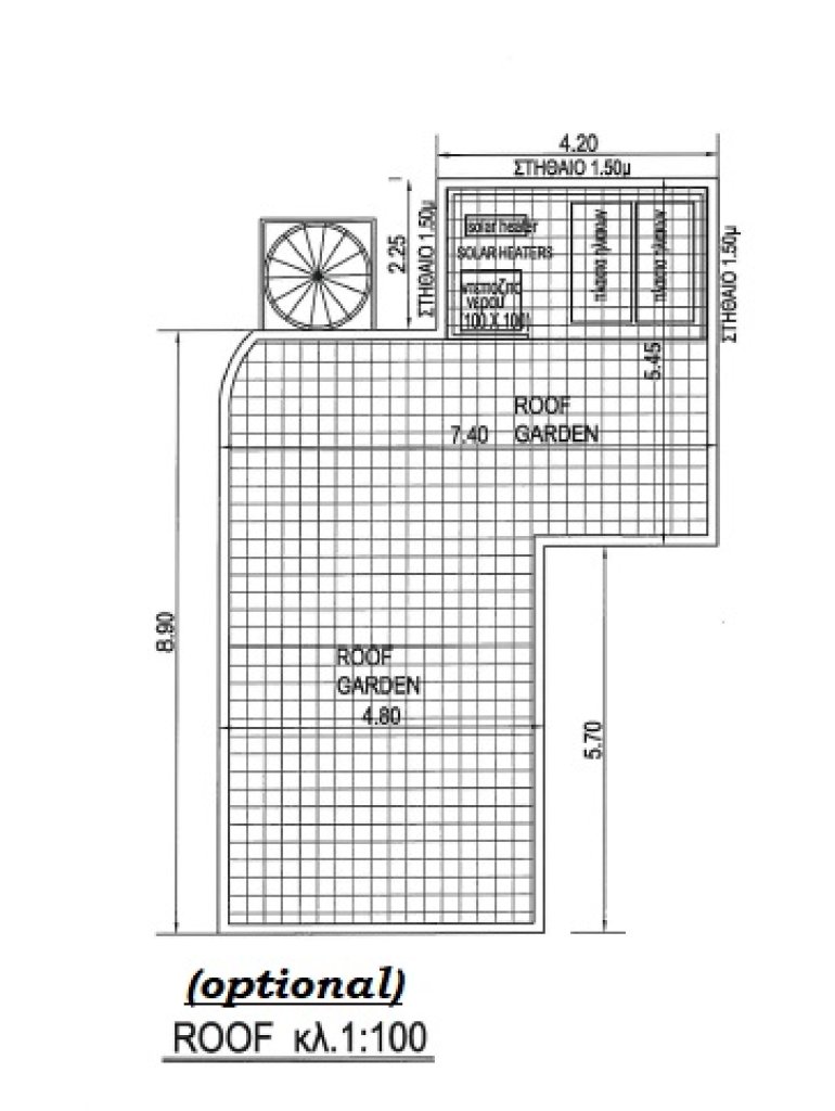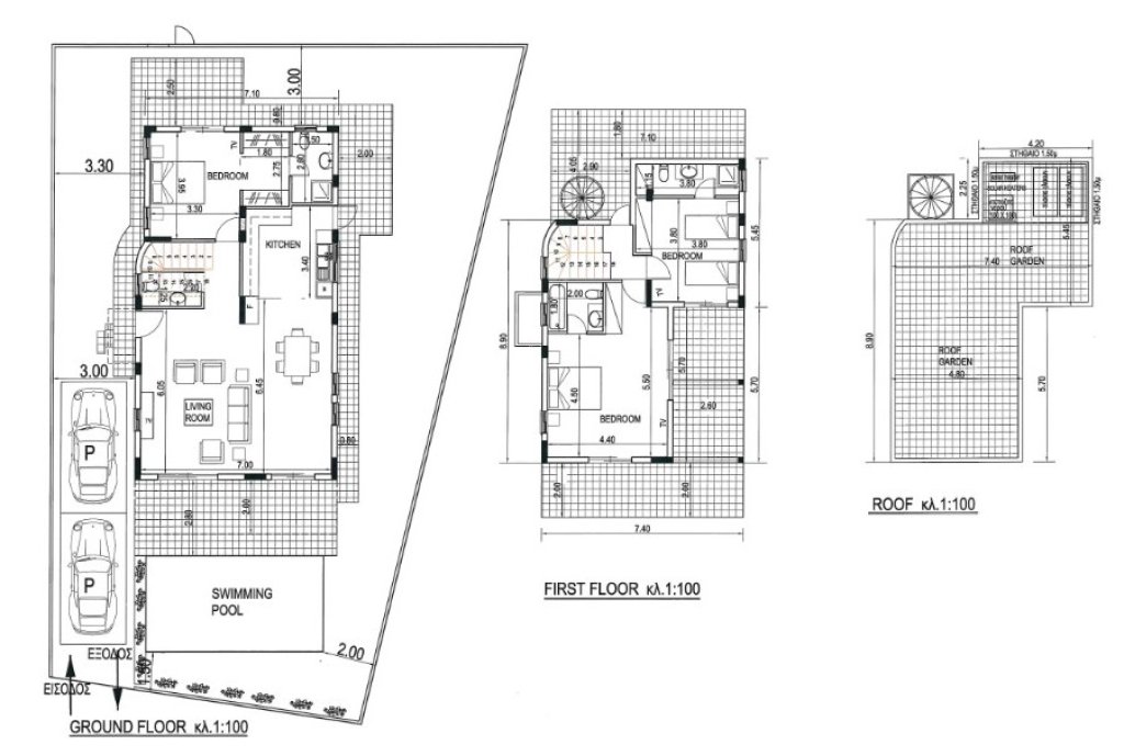 The ground floor is consisting of open plan kitchen, dining and living area, one bedroom with en-suite bathroom and a guest toilet. The veranda door is leading outside to the covered veranda and the swimming pool. On the first floor are 2 bedrooms, both featuring en-suite bathrooms and exit to covered balconies. From the first floor, spiral stairs are leading up to a fantastic roof garden, perfect for entertaining and leisure.