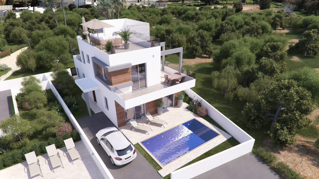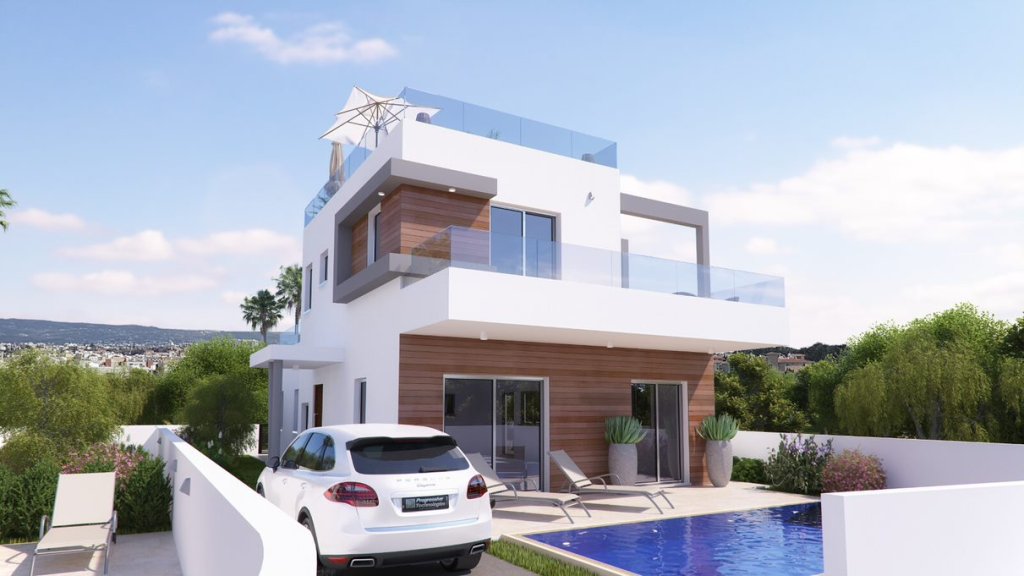 3 bedroom, 4 baths villa for sale is a part of a new project in Paphos, near Kings Avenue Mall. The project consists of apartment building, with a total of 14 units and this amazing villa, and it is located in one of the most popular residential areas of Paphos. The project if featuring covered parking for tenants, a communal swimming pool, a jacuzzi and a playground.