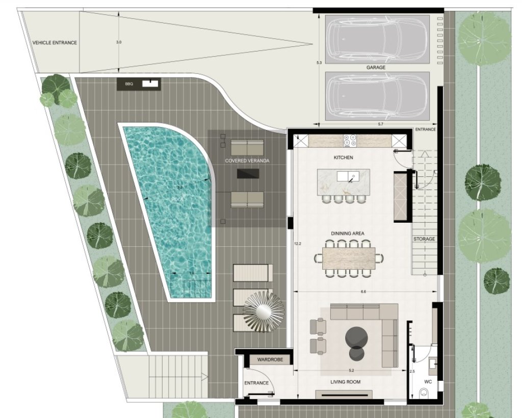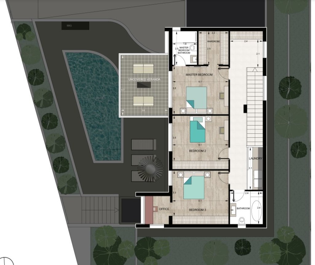 The total covered area of this villa is 200 sqm and the plot size is 410 sqm. The ground consists of an open plan kitchen, dining, living area, guest toilet and the exit outside to the pool area and garden. On the first floor are 3 bedrooms and a family bathroom. The master bedroom features an en-suite bathroom, walk-in wardrobe and exit to an uncovered balcony.