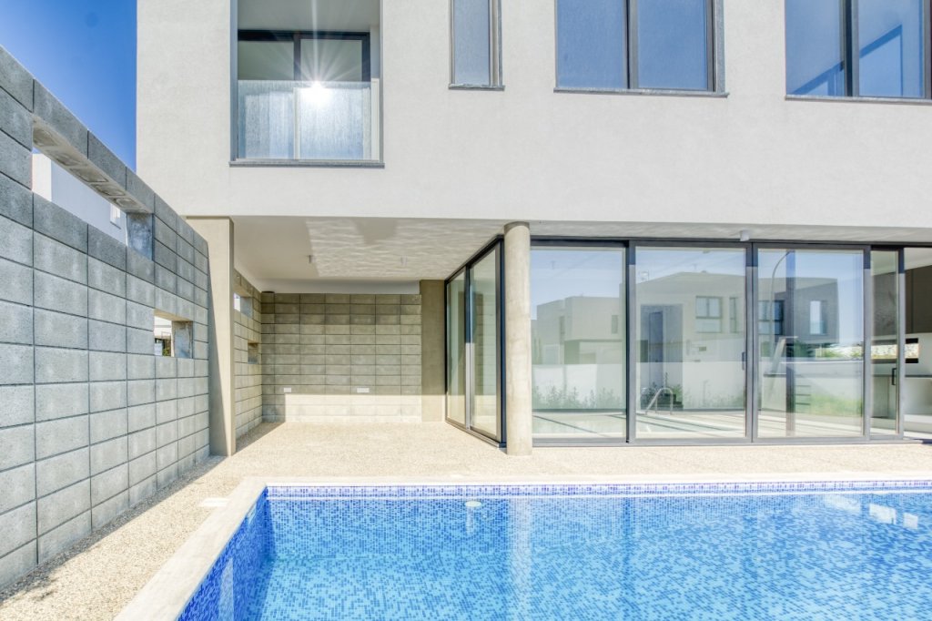 Inside is a large open-plan living area with a modern designer kitchen, a spacious dining area, and a salon looking out to the pool and garden. Upstairs find 3 large bedrooms, one with an en suite bathroom and two with a shared bathroom.