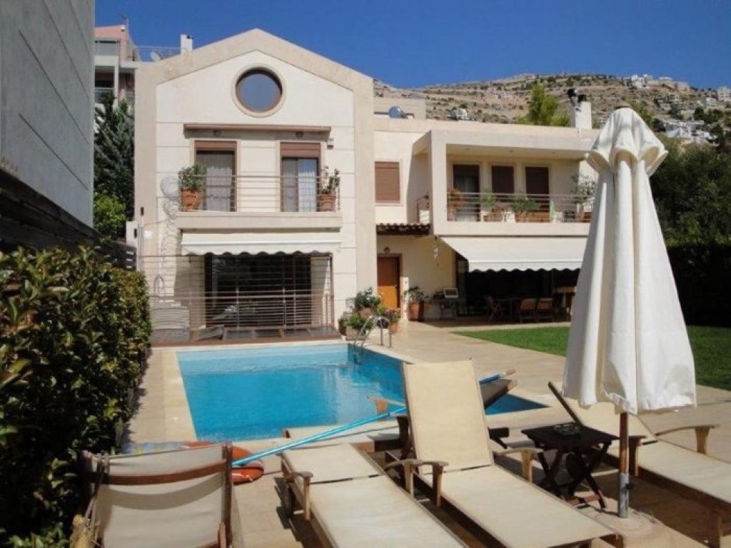 Villa's covered areas are 330sq.m., with private swimming pool. The ground floor is 120m2 (living room with fireplace, dining, kitchen superb style, wc ). The first floor has 2 master bedrooms with huge wardrobes and baths, sea view from the first floor and attic 40sq.m. Basement has three rooms looking very nice and neat, there are WC and shower, washing machine room and two parking spaces. Heating with oil on every floor. Αir condition Daikin in all house; solar panel system and CCTV, alarm system. The price is €635.000 which comes around €1.900 Per sqm !!!
