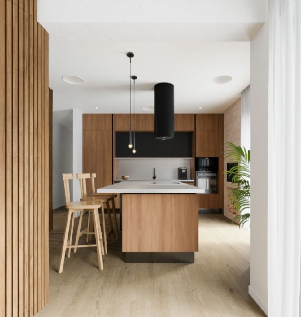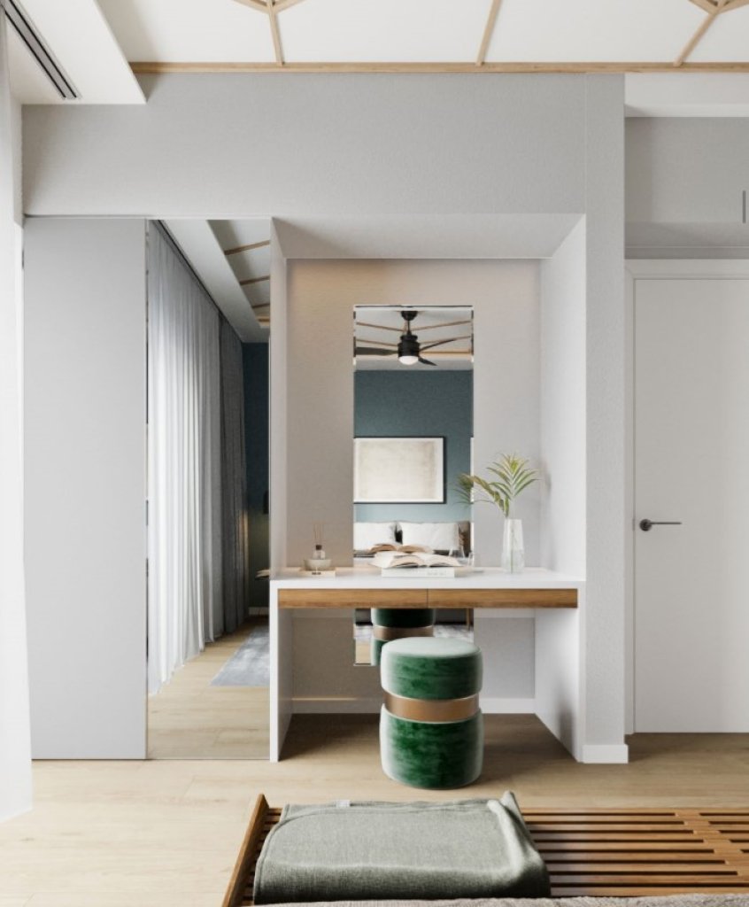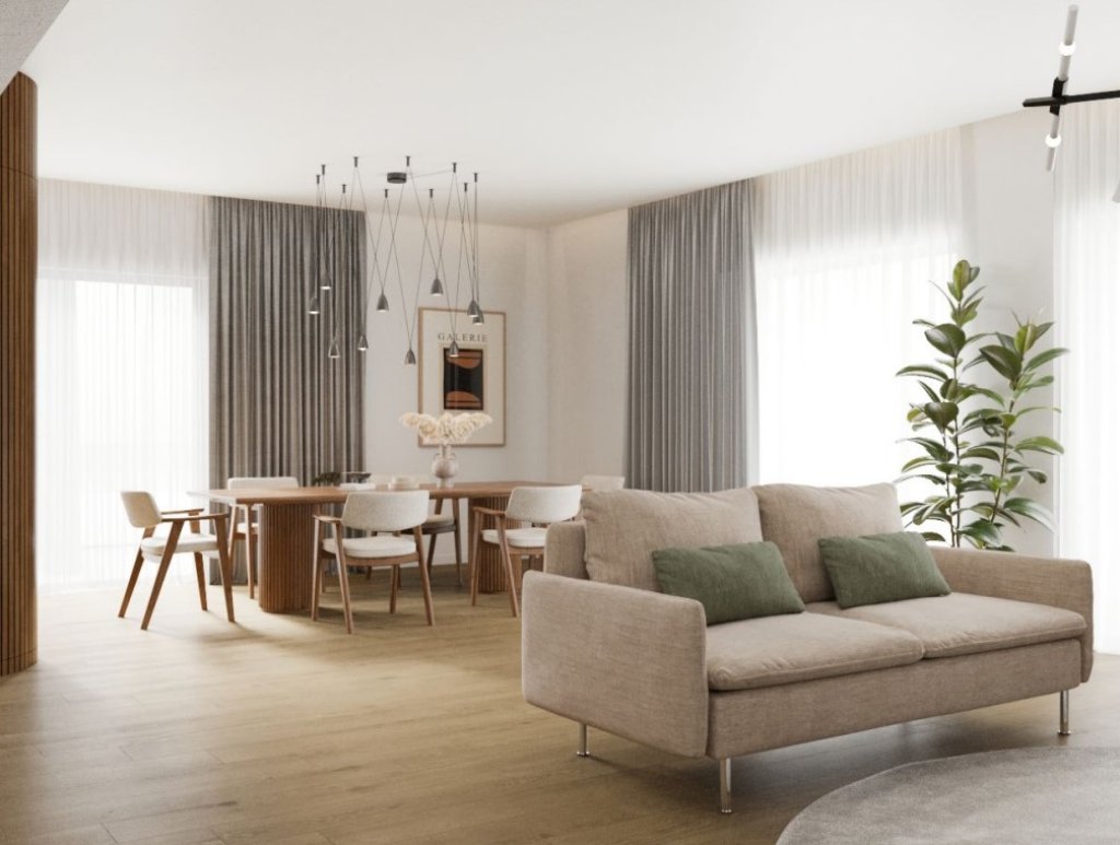 This apartment occupies 1st floor with an interior covered area of 180 sqm and a veranda of 110 sqm. From the entrance, on the right is an open plan living and dining area, that leads further to a separated kitchen. On the left from the entrance, the corridor is leading to separated bedrooms and bathrooms. The Master bedroom features en-suite bathroom and balconies all around.
