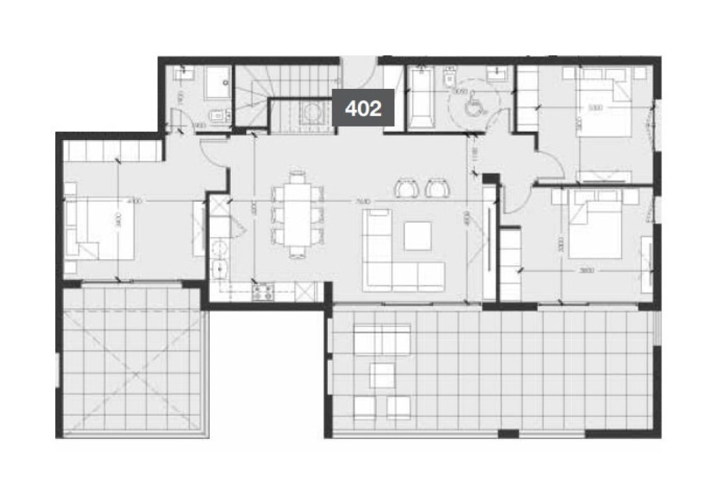 This modern 4 bedroom, 3 baths apartment has an internal covered area of 116.50 sqm with an additional 35.4 sqm of the covered veranda and 73.4 sqm roof terrace. The penthouse is laid out on two levels. Open plan living, dining and kitchen area, 2 bedrooms with a bathroom and master bedroom with en-suite bathroom are at a lower level, and 4th bedroom, bathroom and partially covered veranda on the upper level.
