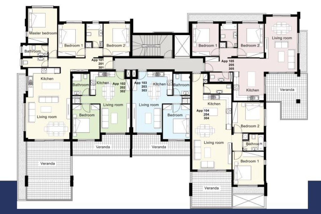 Each block has three 3 bedroom, seven 2 bedroom and six 1 bedroom apartments. In addition it features four penthouses on the top floor - one 3 bedrooms and three 2 bedrooms.