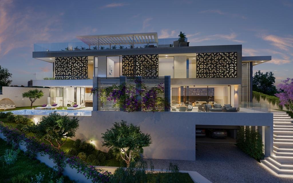 Open living spaces and large floor plans provide the true feel of a contemporary lifestyle characteristic by an awe-inspiring end-to-end panorama on the main level, and stunning interior elements that feature high ceilings and advanced amenities: high-tech kitchen, gym with shower, Jacuzzi, spa, maid's rooms, a lift to all levels, spacious garages, beautiful balconies, a sunken seating area, and lush poolside landscaping.