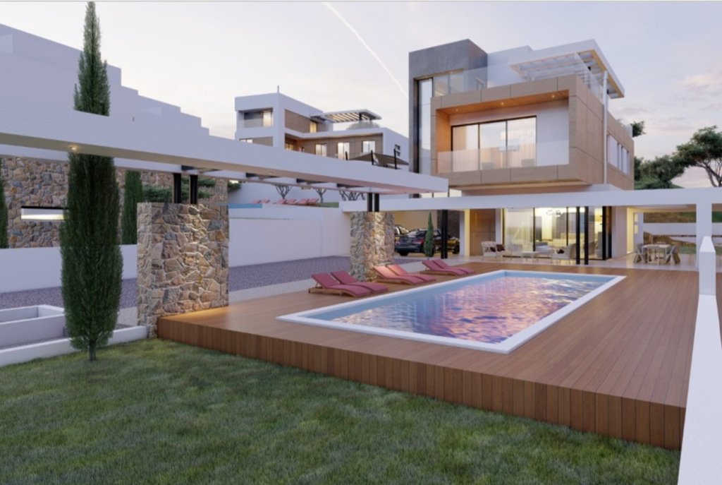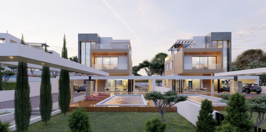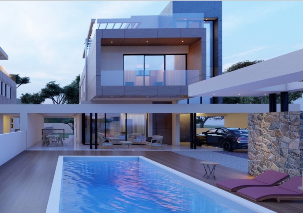 Modern off-plan 5 bedroom, 5 baths villa for sale in Agios Tychonas. It is part of the project of 14 luxury villas in a popular residential area of Limassol. The plot size is 856 sqm with a private pool, back garden and 2 parking places. The total covered area of this amazing villa is 405 sqm including the interior living area, covered verandas, roof covered area, storage and covered parking.