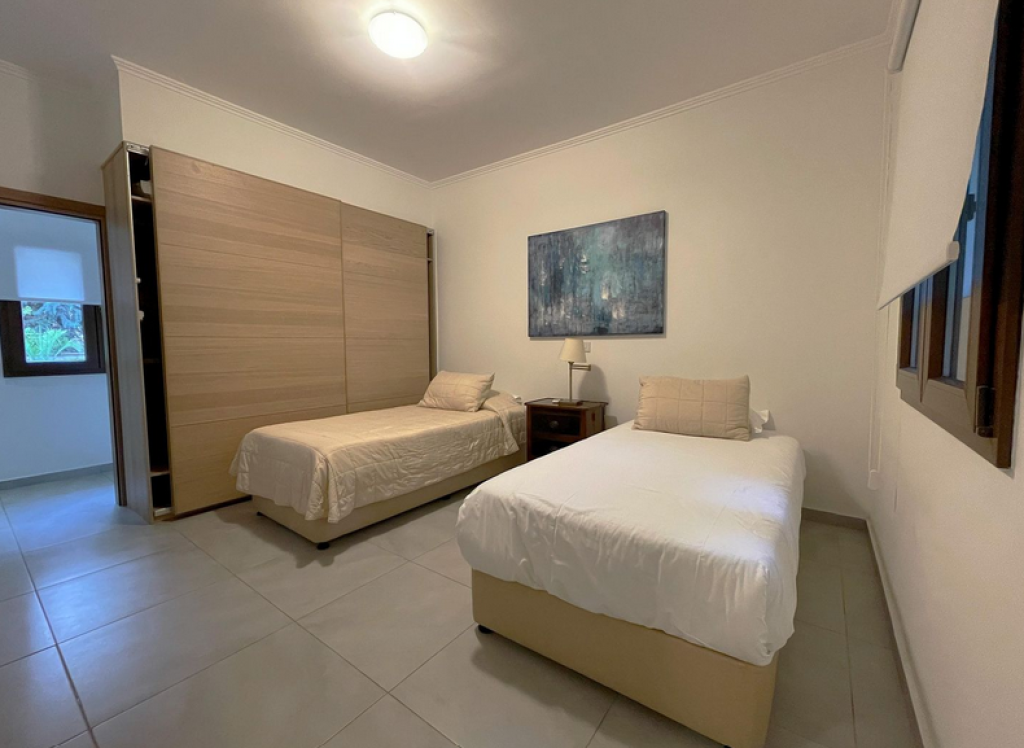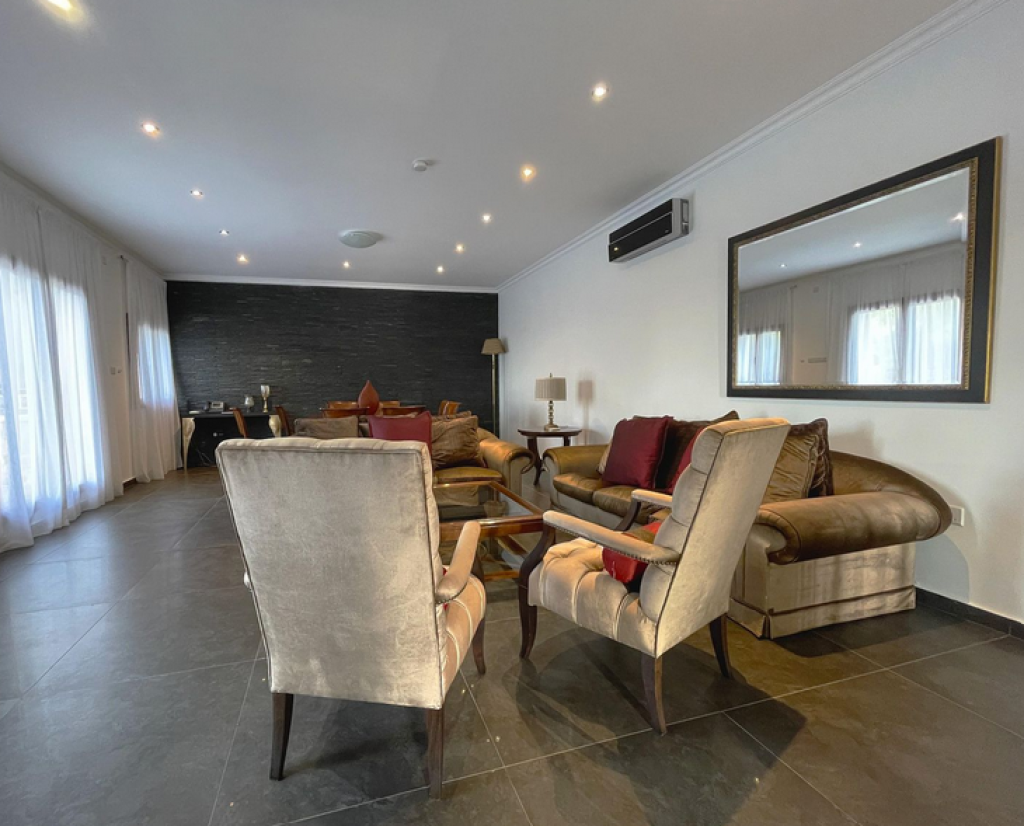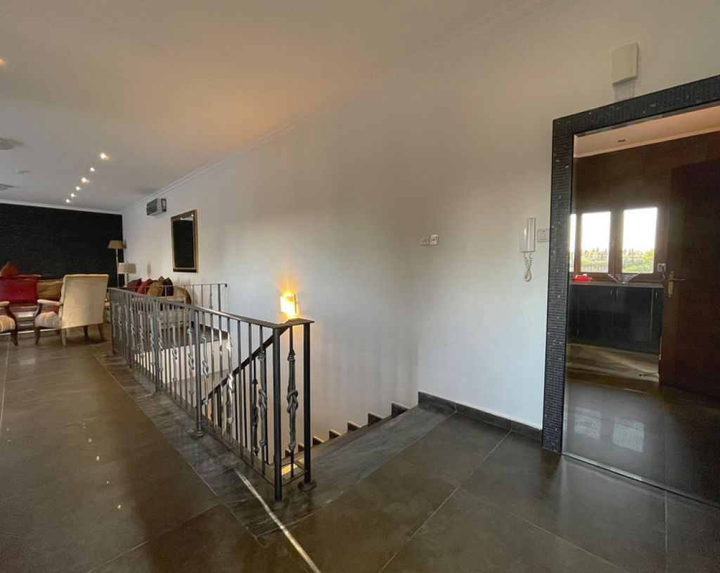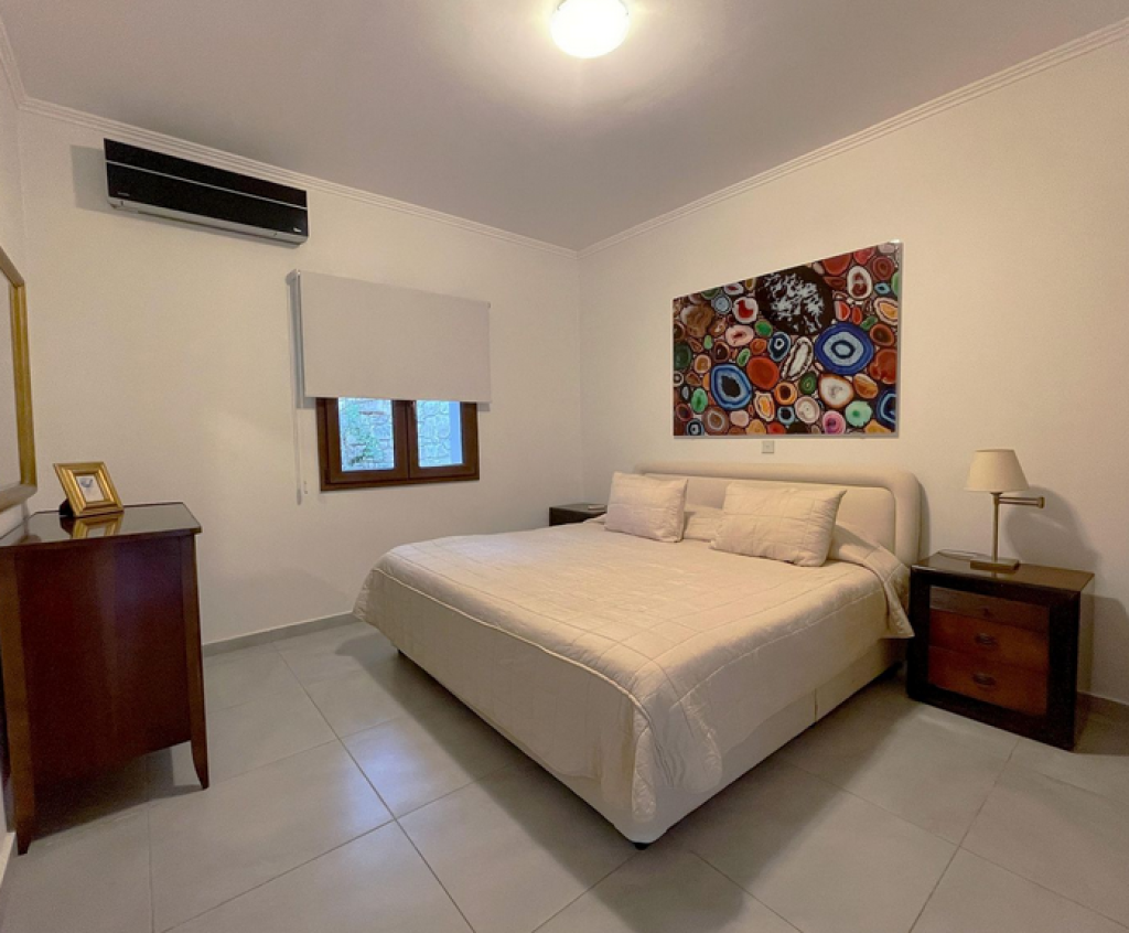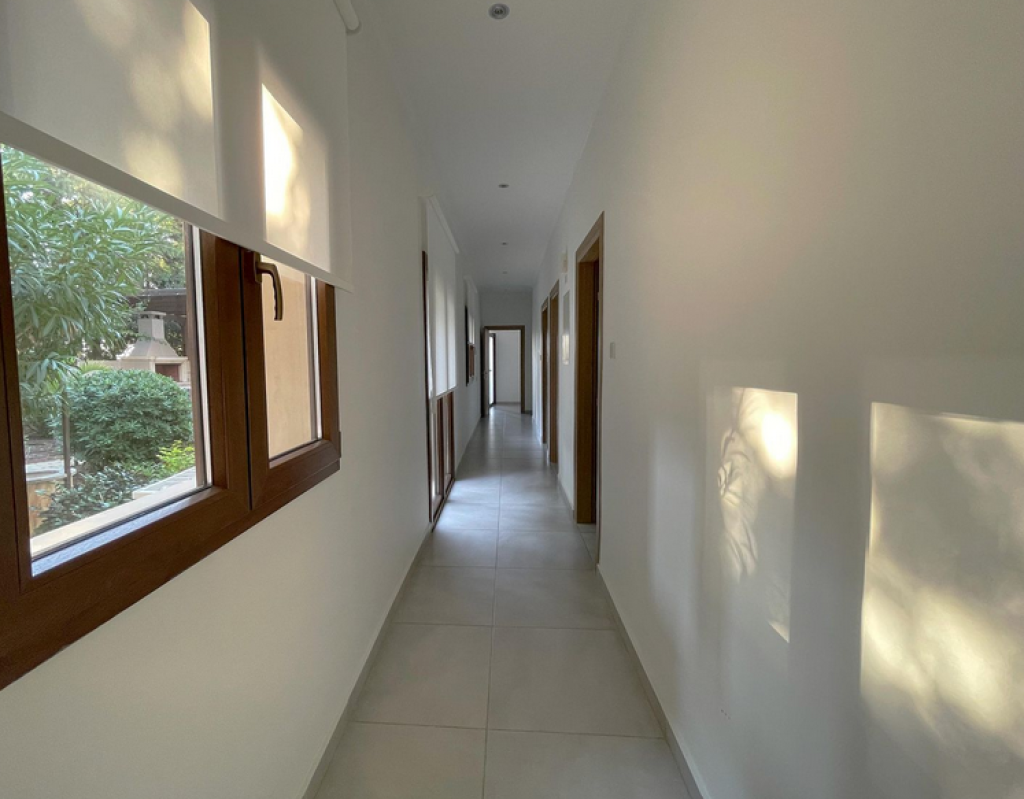 Five-bedroom house in Aphrodite Hills, Paphos. The villa is on two levels comprises of an entrance, living/dining area, kitchen with auxiliary kitchen, storage room, plant room, five bedrooms, verandas and garden. The master bedroom is fitted with an en-suite bathroom, two bedrooms are fitted with an en-suite shower whilst two further bedrooms have common access to a shower room at lower ground floor level. It enjoys private swimming pool , landscape gardens and uncovered parking space.