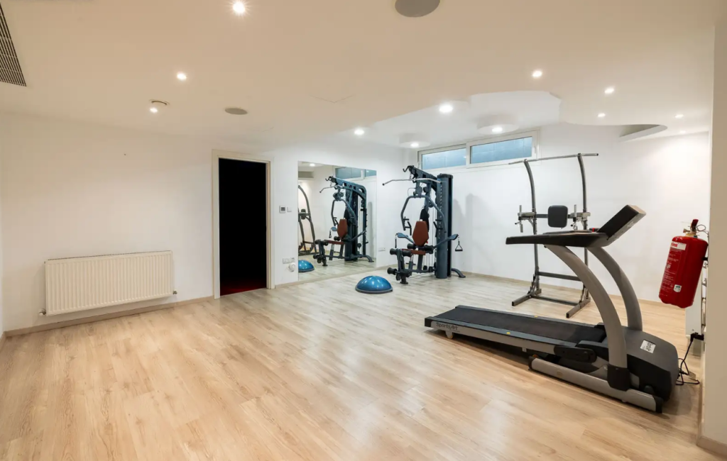 The ground floor offers a gym, massage room, sauna, cinema room, auxiliary kitchen, laundry, and pantry. Guests or staff can utilize a separate guest house. The property includes parking for two cars, a beautifully landscaped garden with a private swimming pool, and a covered barbecue area.