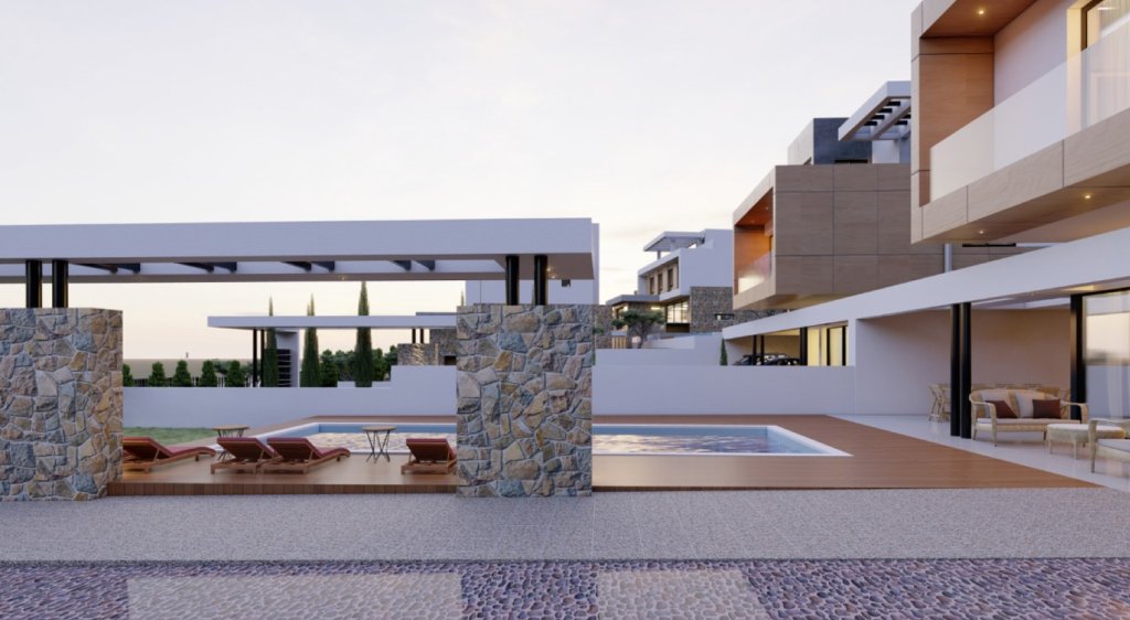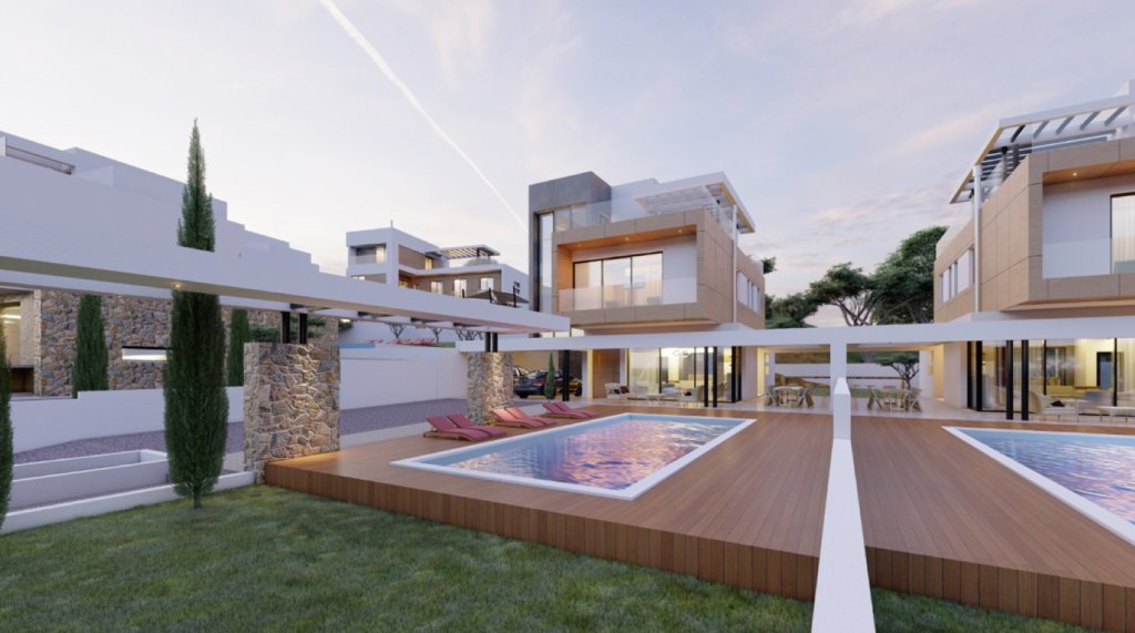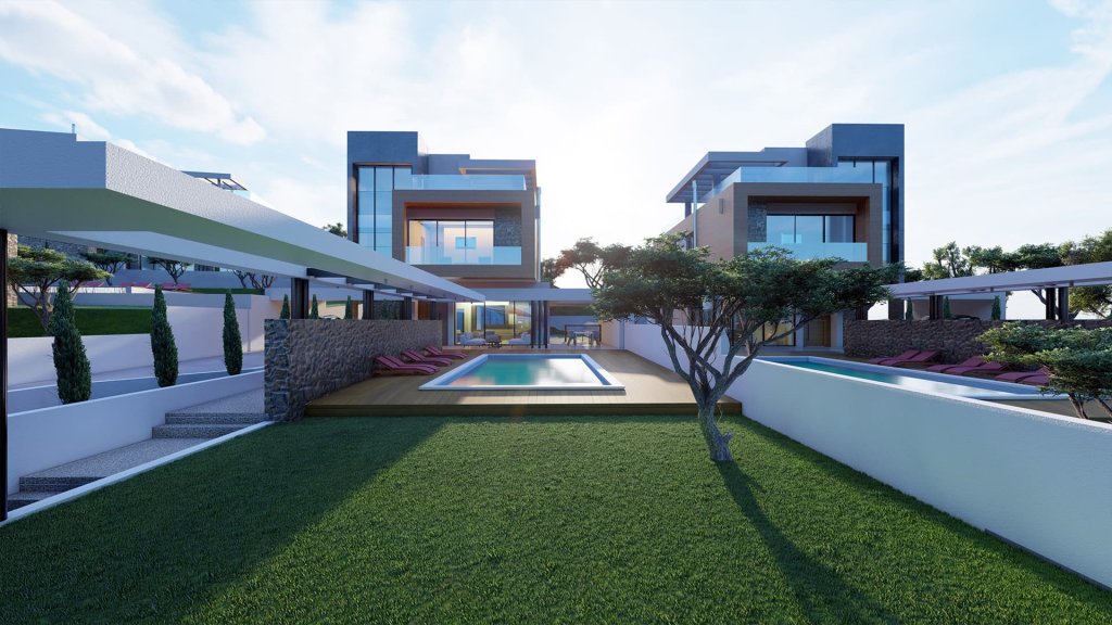 Large private swimming pools in private landscaped gardens. Sun terraces with an outdoor bar and lounging areas. Private covered parking. Each villa is designed to maximize light and space and is finished with, the most up-to-date, high-quality materials and fittings.
