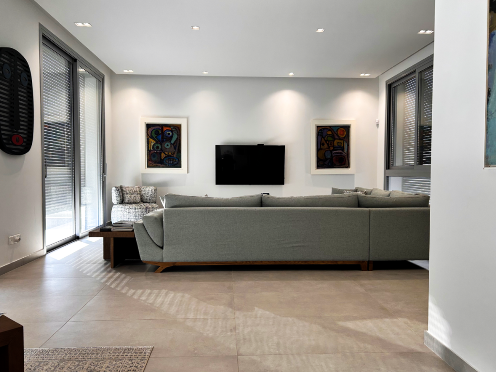 A sizable living space for lounging and hosting family get togethers, which again leads to a sizable covered balcony with breathtaking views of the sea and the pool area.