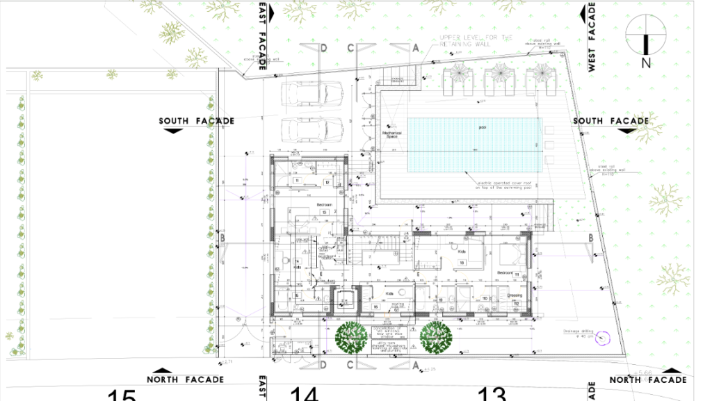 Lower level floor, offers 4 bedrooms, each with there own bathroom, TV area and studio office. Server room and laundry area. Large covered balcony. From the lower level, one can access the pool area, garden area and BBQ area.