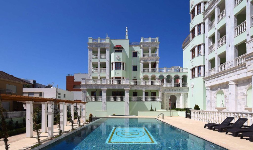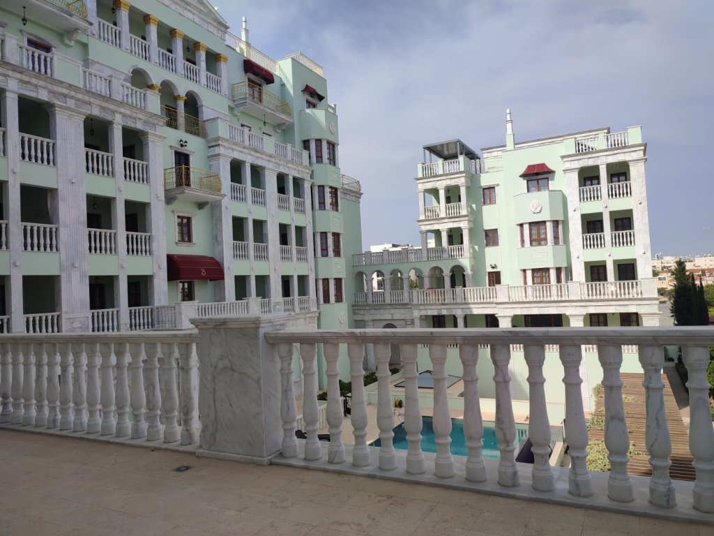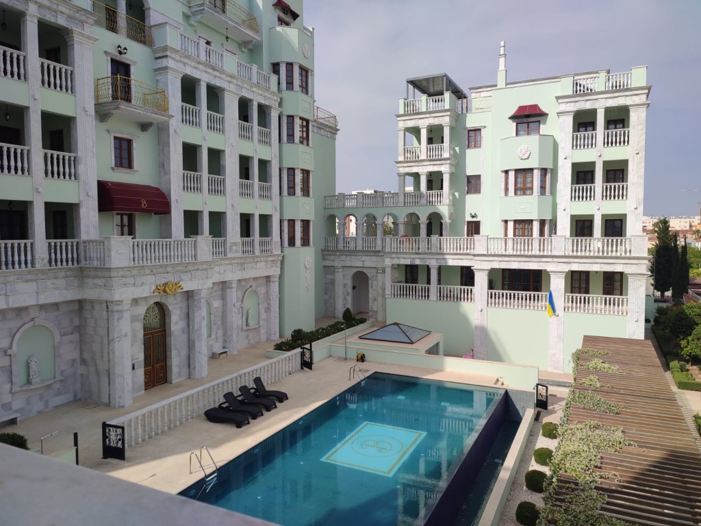 The building complex consists of 3 blocks, creating a symmetrical harmonious U-shaped structure. The units are connected by columned arches with stonework. In the center of the complex, there is a large swimming pool finished with mosaics. The large area of the plot accommodates, apart from the swimming pool, a spacious recreational area with landscaped English garden.