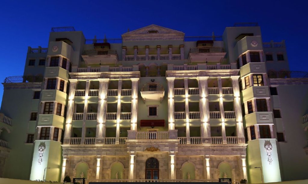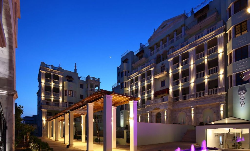 Elaborately finished front entrance. Expensive marble, beautiful chandeliers and furniture. Classical music plays at the entrance of the lobby.