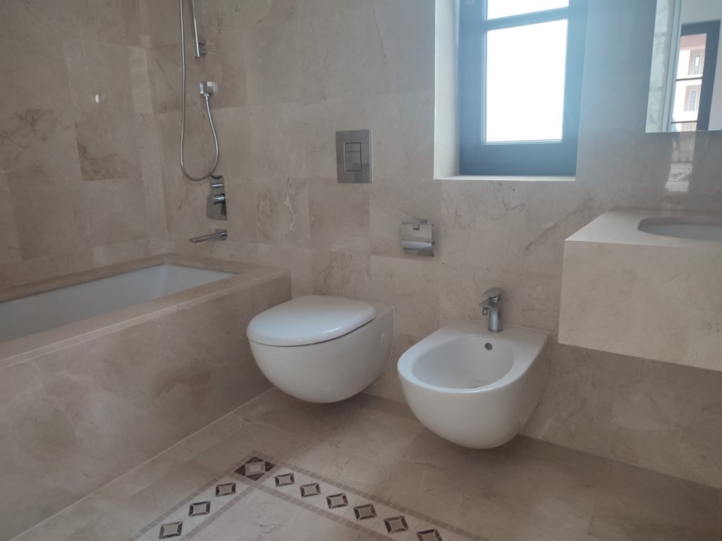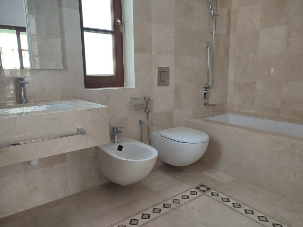 Bathroom floors and walls are laid with expensive sorts of marble and granites