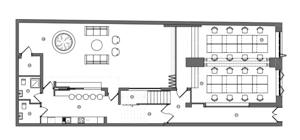 Office space covers 300 sqm, with an additional 80 sqm rooftop and 700 sqm yard. It features 2 toilets and the kitchen/dining area.